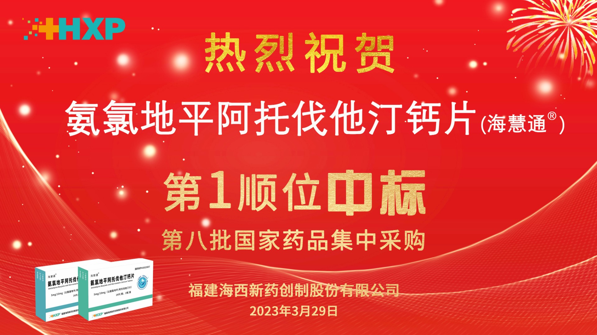 2023年3月29日,國家醫(yī)保局等相關部門組織的第八批國家藥品集中采購開標,海西新藥已(視同)通過仿制藥一致性評價的產品氨氯地平阿托伐他汀鈣片(商標名:海慧通?)以第一順位中標。
